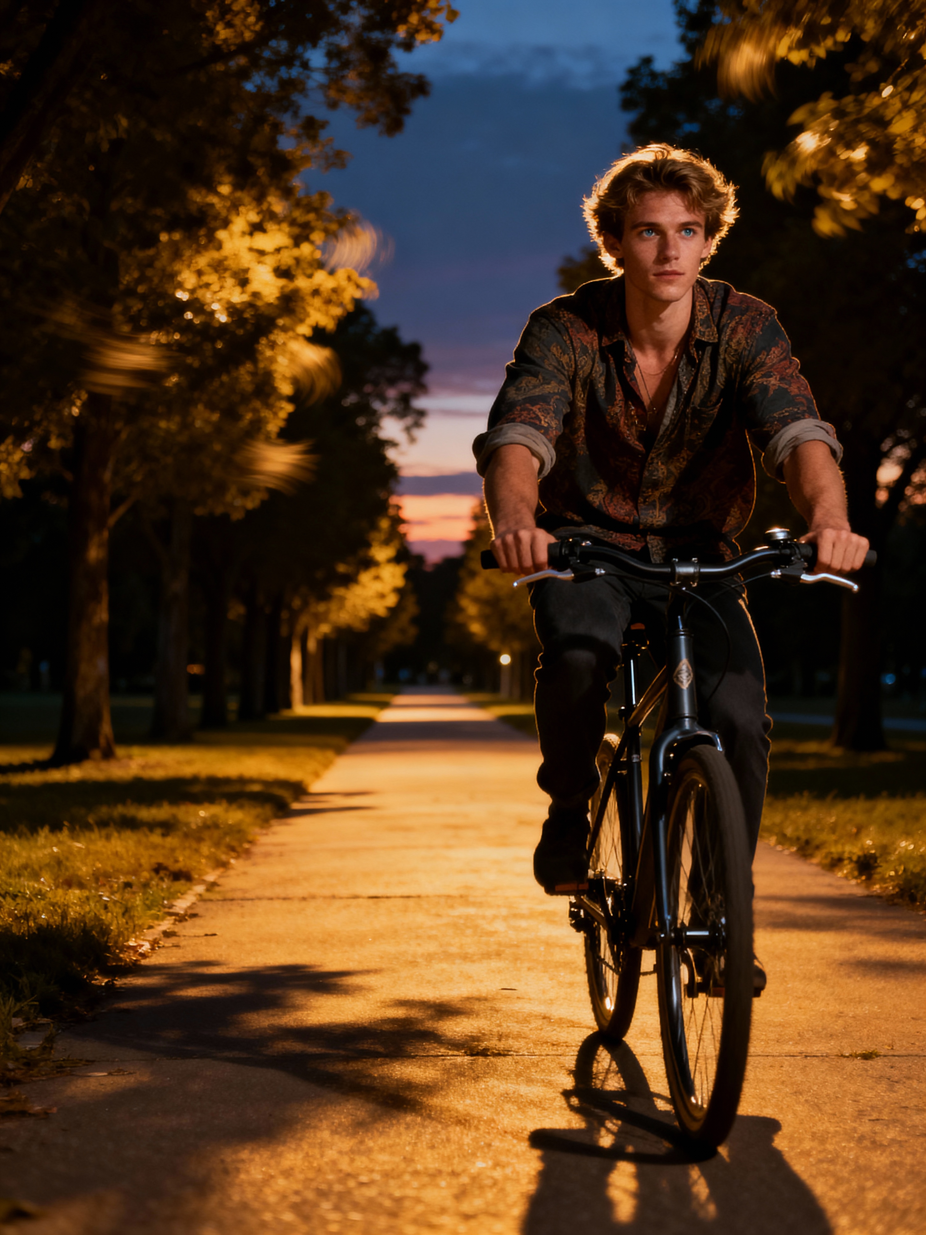 engaging masculine model taking a bike ride on a tree-lined pathway at dusk