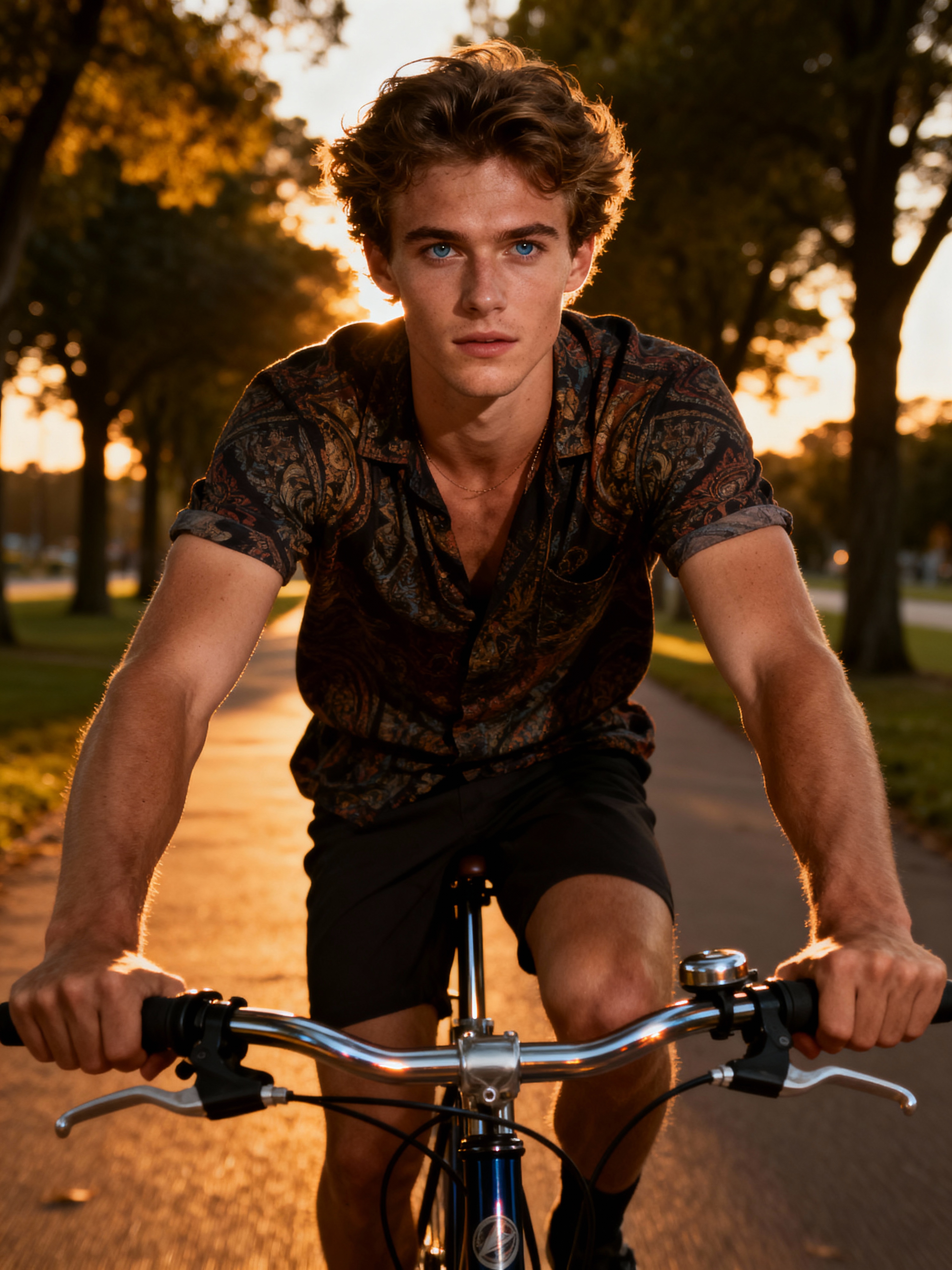 engaging masculine model taking a bike ride on a tree-lined pathway at dusk