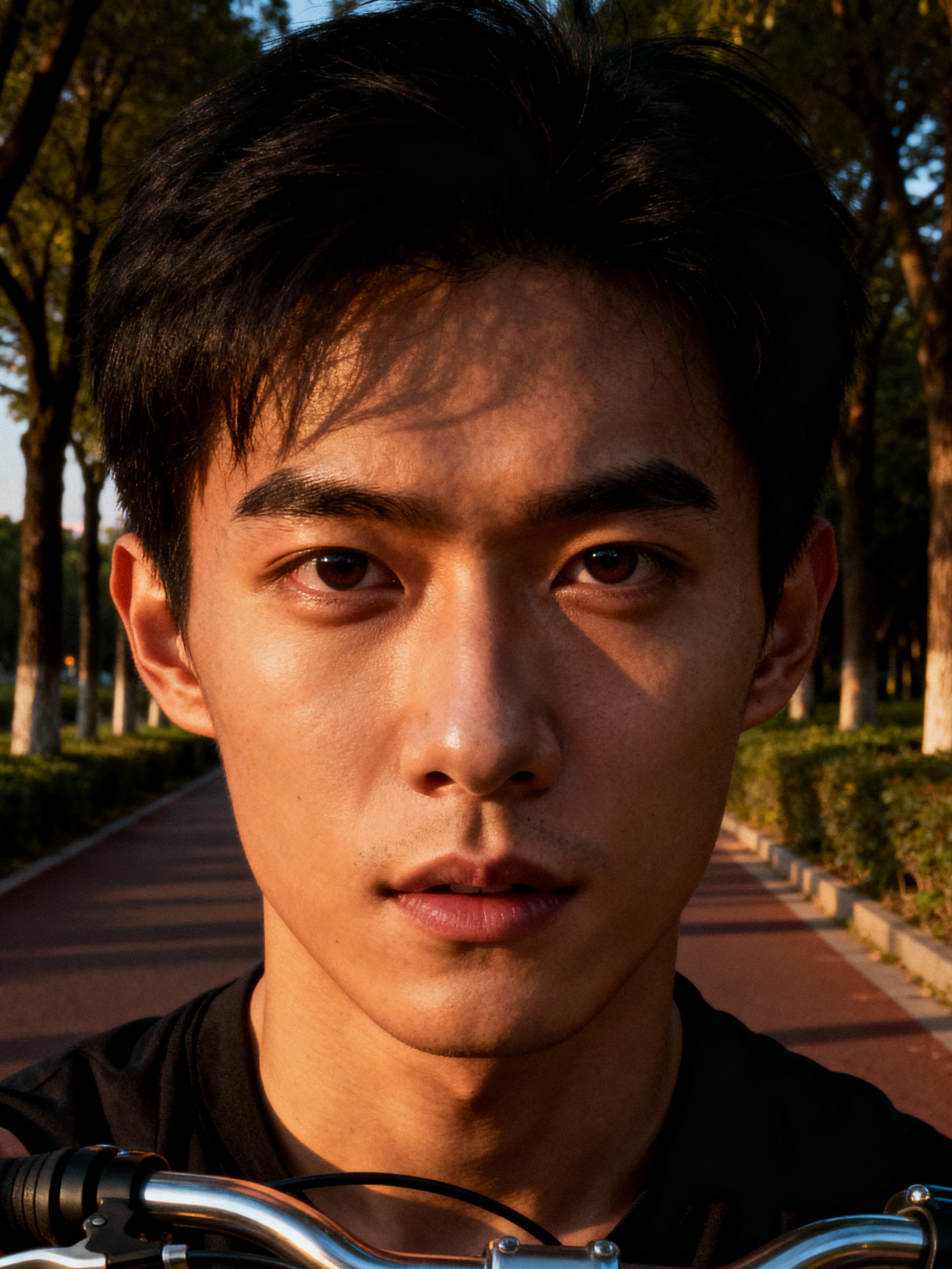 engaging masculine model taking a bike ride on a tree-lined pathway at dusk