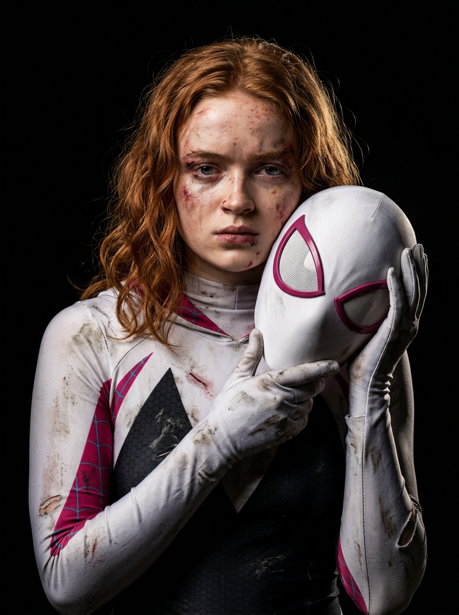 {"environment":{"location":"Dark, minimalist studio setting","background":"Solid, deep black background, completely dark"},"subject":{"person":"Sadie Sink","appearance":{"hair":"Wavy, copper red hair, slightly messy","face":"Injured, with dirt, cuts, scratches, and grime, tired expression, tear stains","eyes":"Blue eyes, looking intently at camera"}},"pose":{"action":"Holding a white Ghost-Spider mask with both gloved hands, pressing it against her cheek","body_language":"Somber, weary, introspective"},"lighting":{"type":"Dramatic studio lighting, directional from upper right","quality":"Soft highlights on face and suit texture, deep shadows"},"clothes_and_styling":{"costume":"Ghost-Spider (Gwen Stacy) superhero suit","details":"White fabric with pink and black accents, torn, dirty, scuffed, worn, realistic textures","mask":"White textured mask with pink-rimmed eye lenses, held separately"},"mood":"Somber, intense, gritty, emotional, resilient","photography":{"style":"Ultra photorealistic portrait, cinematic quality","camera":"High-resolution DSLR","lens":"Prime lens, f\/2.8","focus":"Sharp focus on subject's face and mask, shallow depth of field","texture":"Emphasizing realistic fabric weave, skin pores, and grime"}}