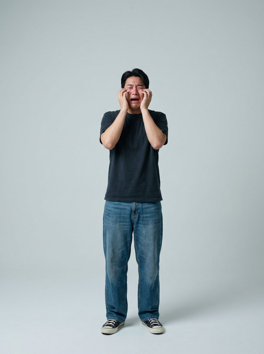 exaggerated crying model, blank background
