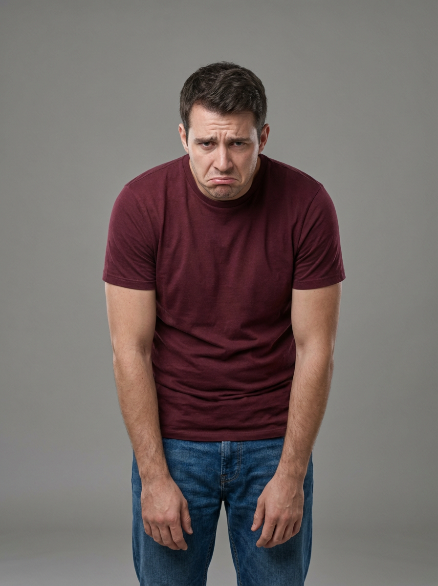 exaggerated sad unhappy miserable depressed sorrow model, blank background
