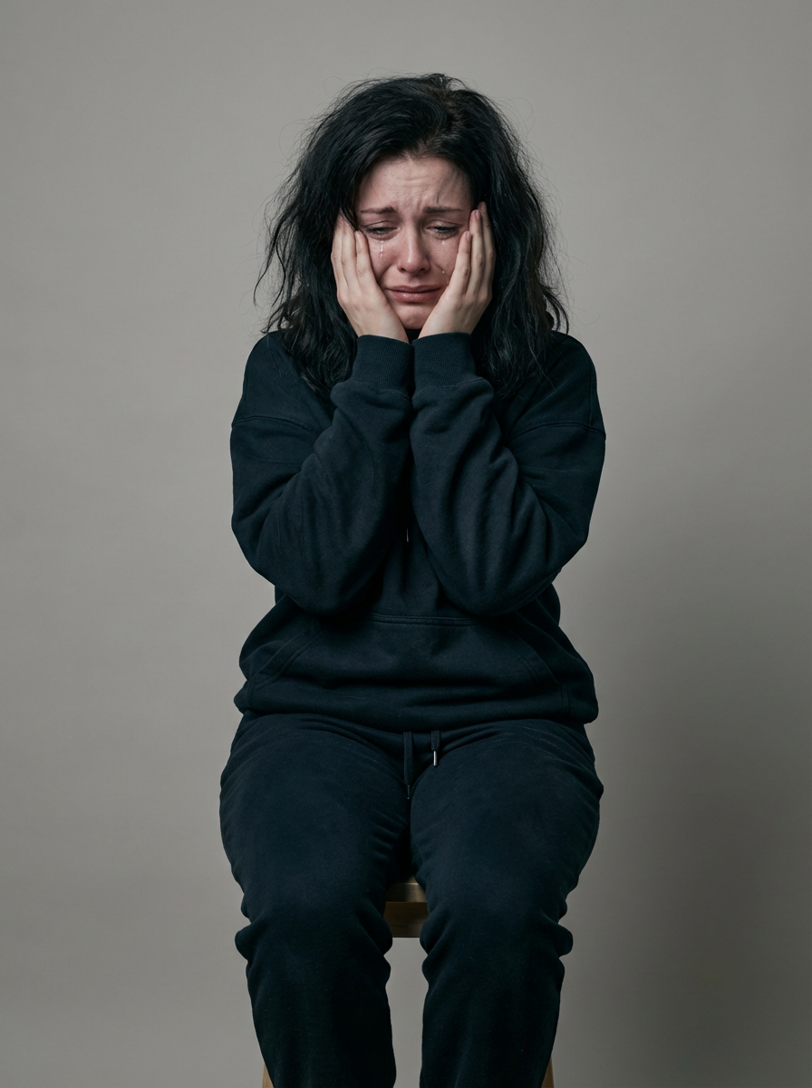 exaggerated sad unhappy miserable depressed sorrow model, blank background