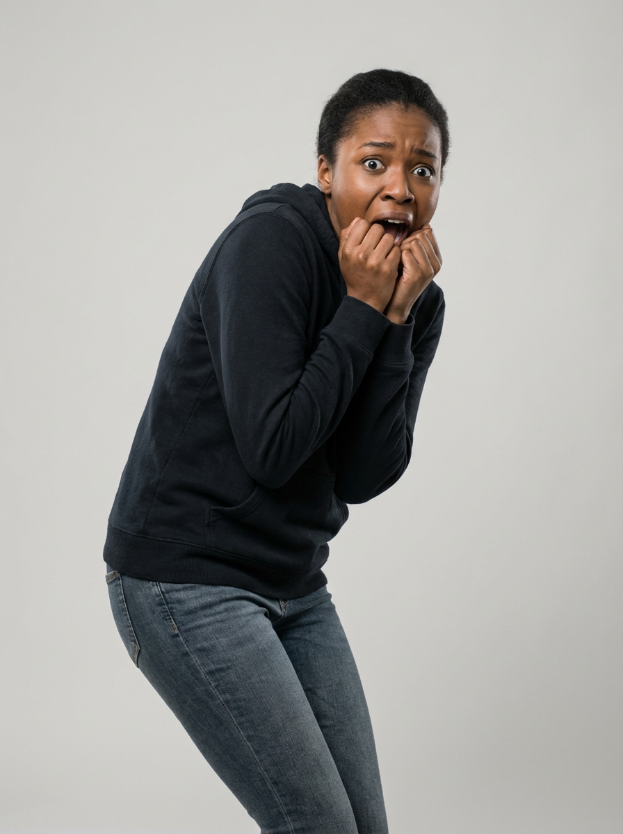 exaggerated scared shocked afraid frightened terrified anxious model, blank background