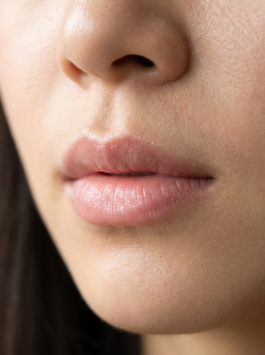 extreme close-up of natural East Asian lips, ultra sheer watery lip essence, zero product, just a whisper of soft pink hydration, dewy but not glossy, realistic skin texture with delicate vellus hair on lips, calm soft window light, no makeup appearance, hyper detailed, lifelike, 8k HDR, professional portrait photography, Canon RF 100mm macro lens.
