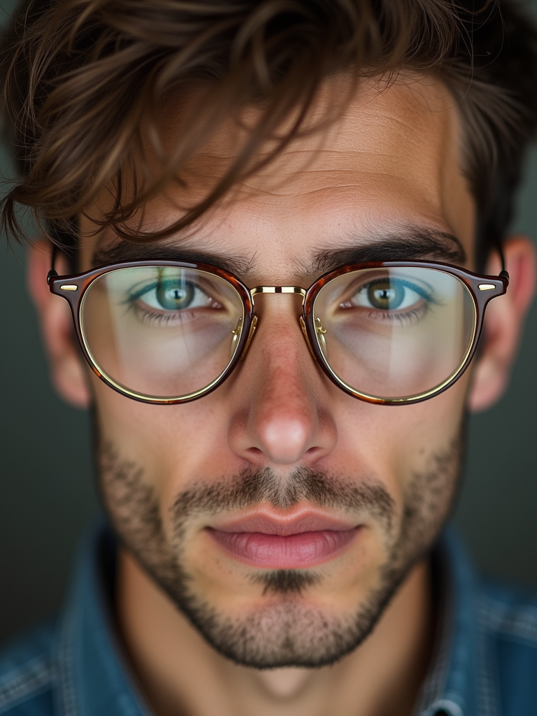 extreme close up portrait of model with gold rimmed glasses