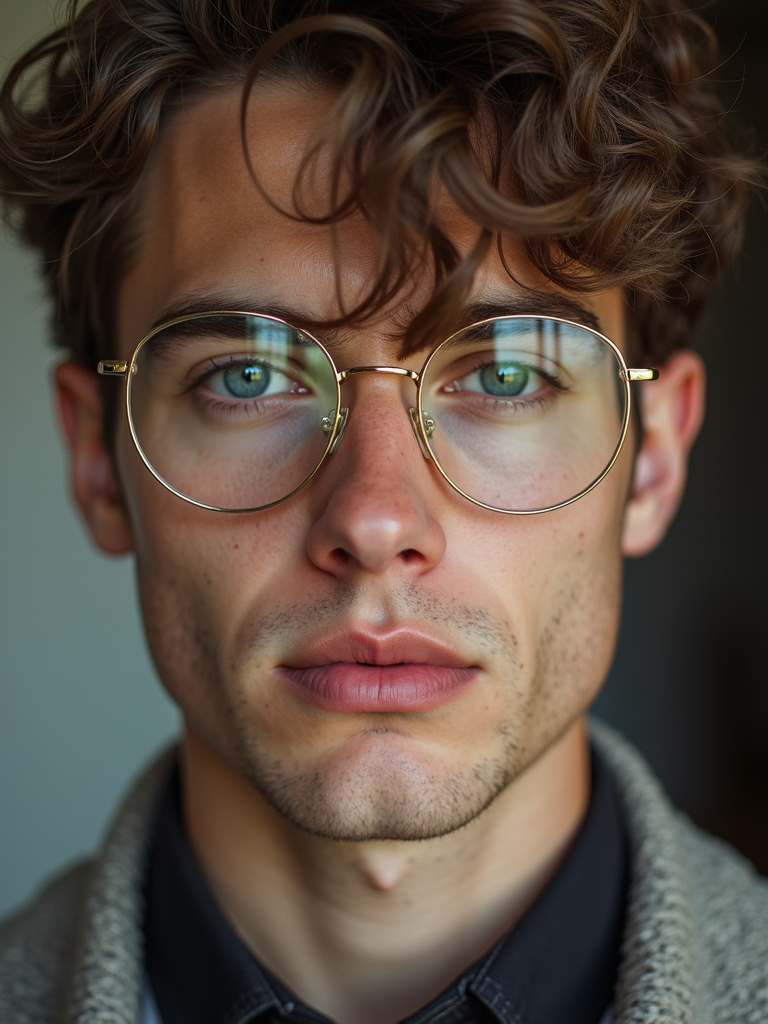 extreme close up portrait of model with gold rimmed glasses