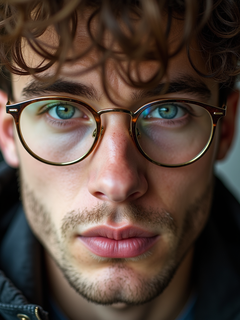 extreme close up portrait of model with gold rimmed glasses