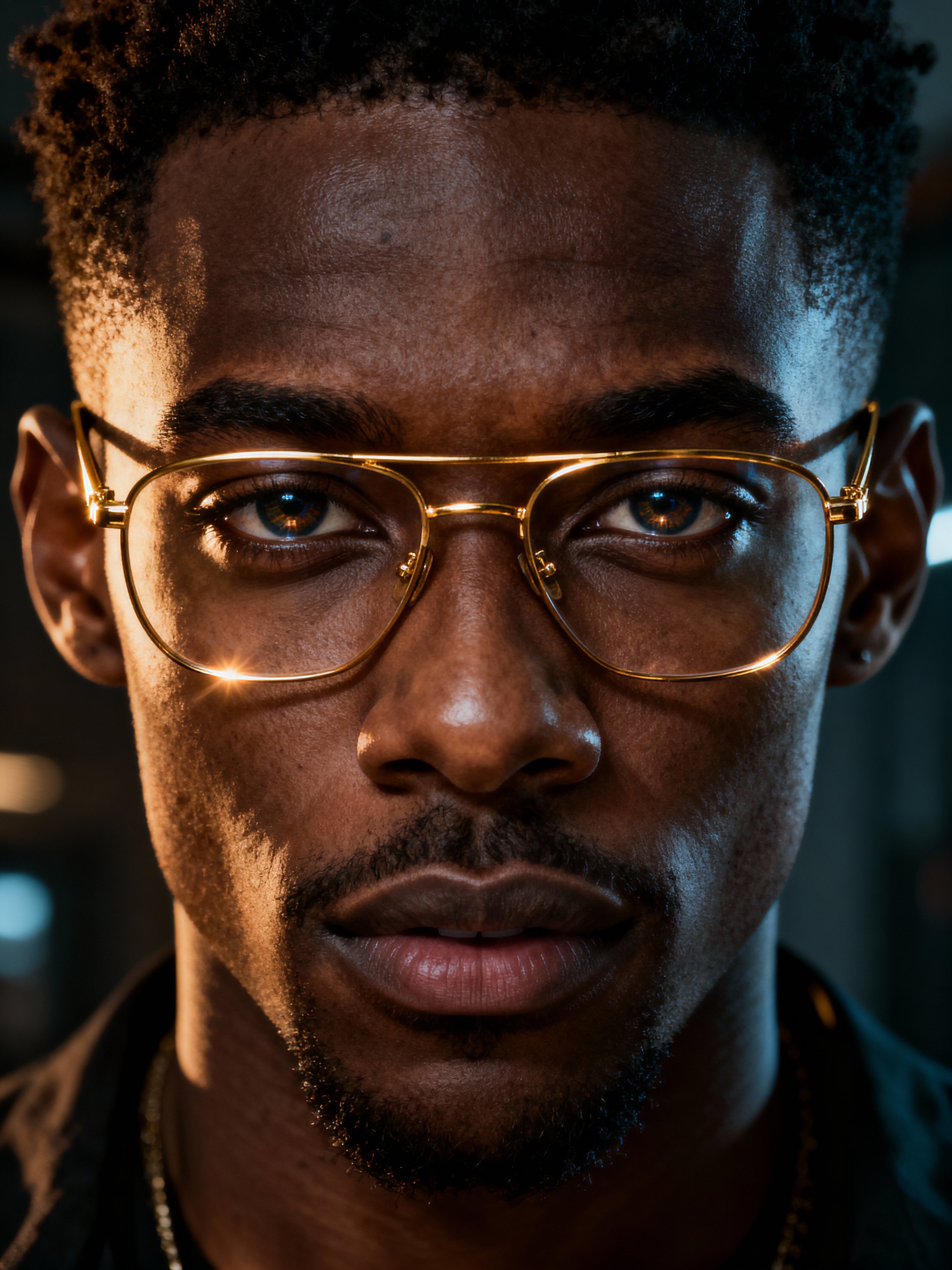 extreme close up portrait of model with gold rimmed glasses