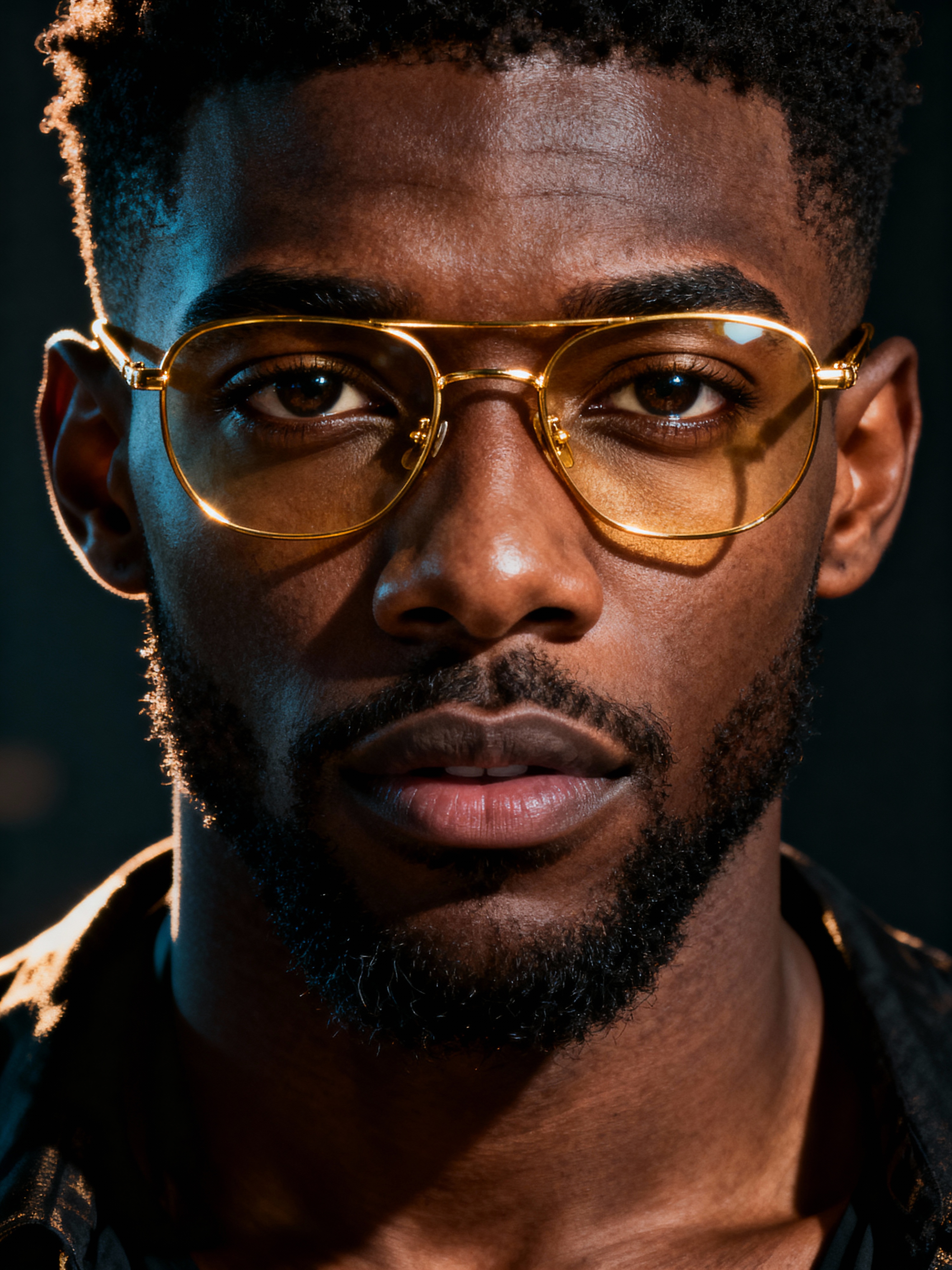 extreme close up portrait of model with gold rimmed glasses