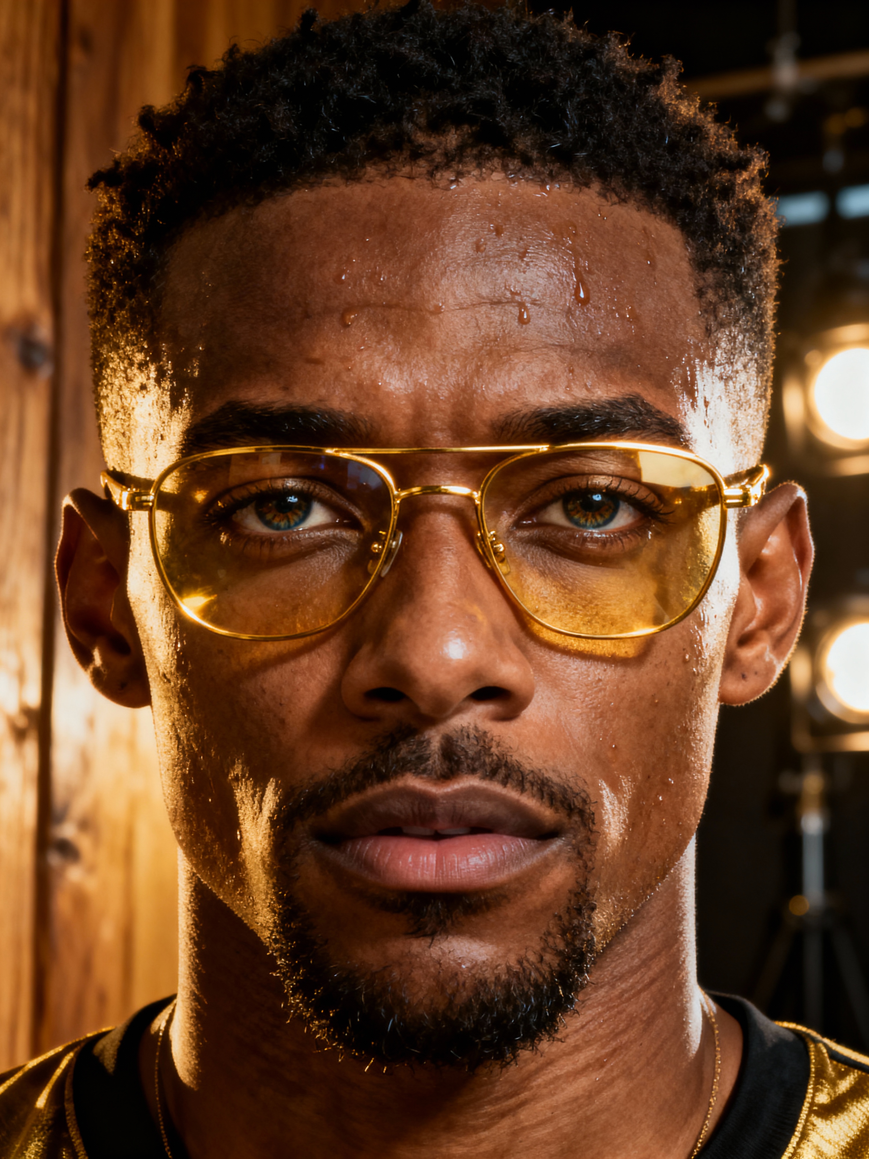extreme close up portrait of model with gold rimmed glasses