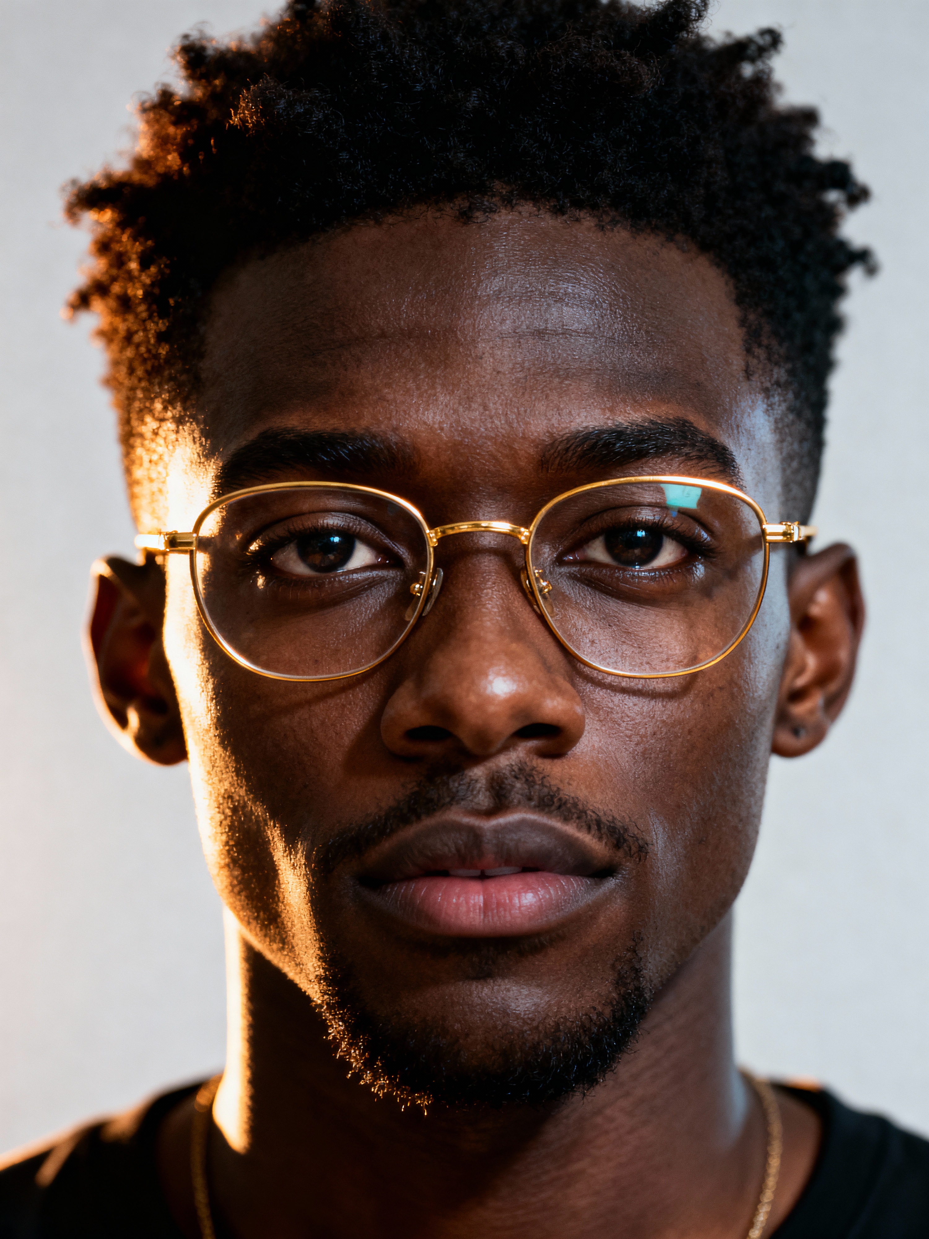 extreme close up portrait of model with gold rimmed glasses