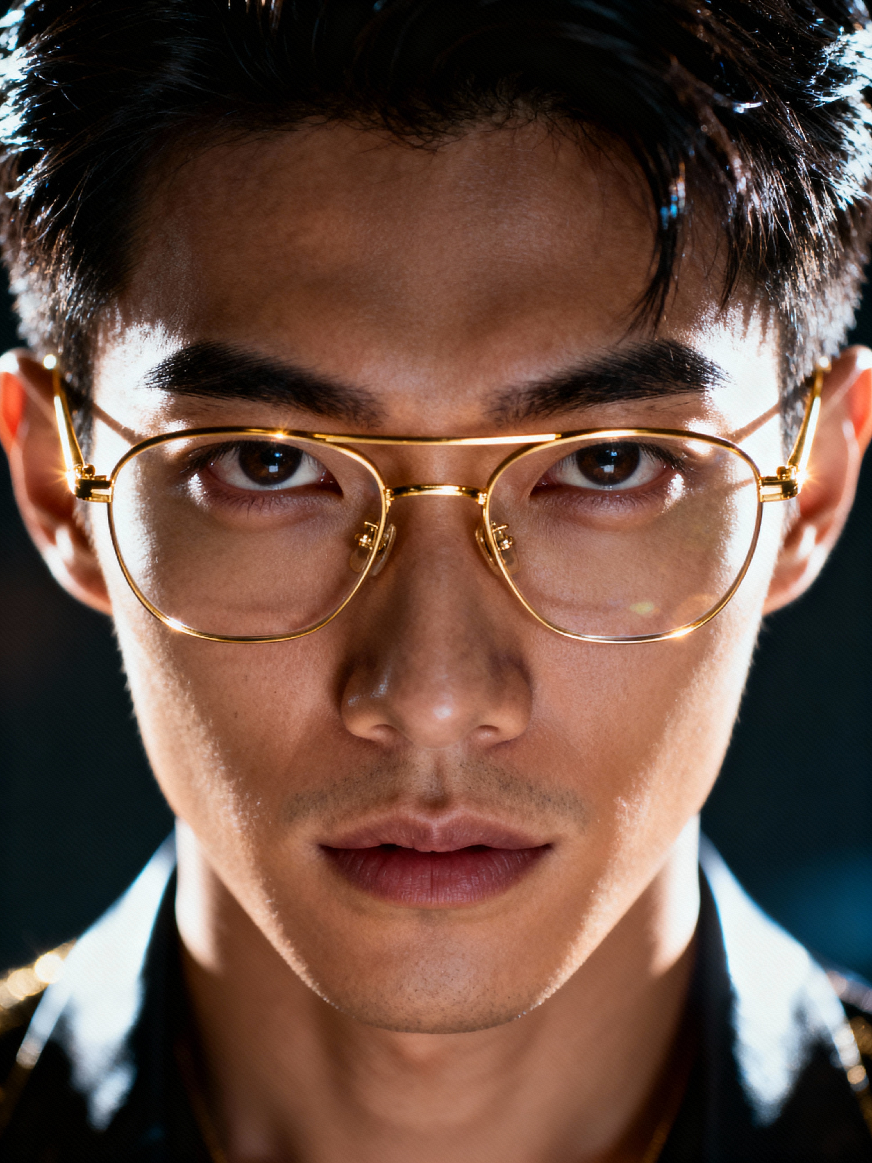extreme close up portrait of model with gold rimmed glasses