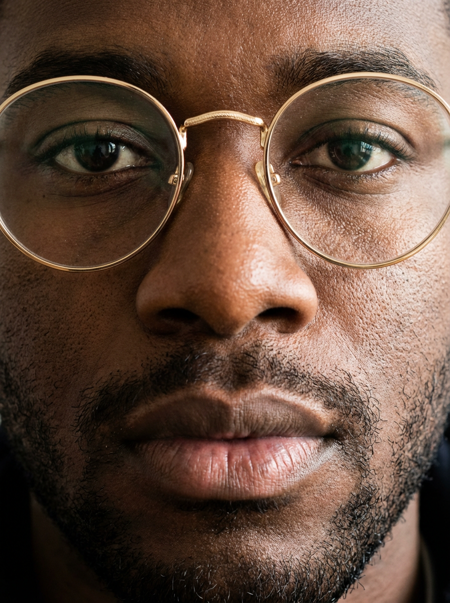 extreme close up portrait of model with gold rimmed glasses