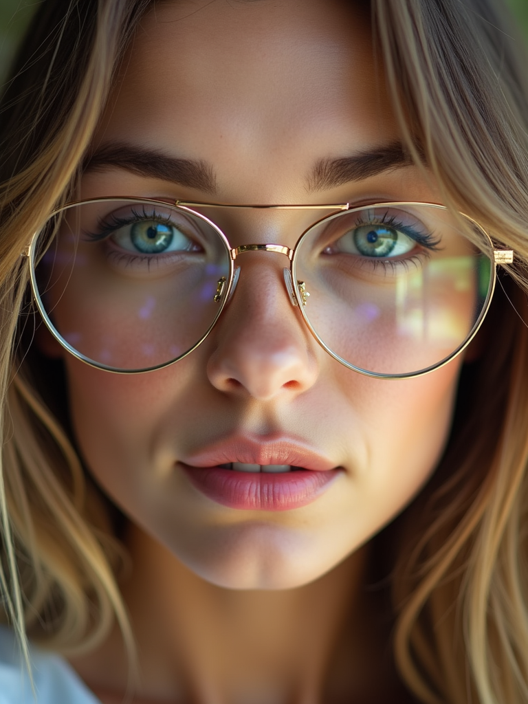 extreme close up portrait of model with gold rimmed glasses
