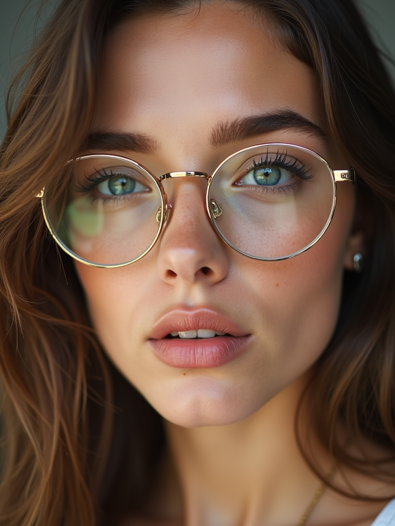 extreme close up portrait of model with gold rimmed glasses