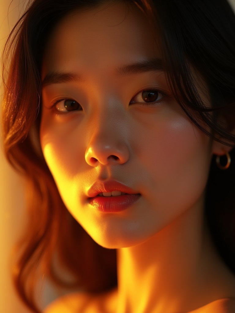 Extreme close-up portrait of model with golden hour lighting. Glowing skin, sensual features highlighted . Dramatic side lighting, cinematic quality.
