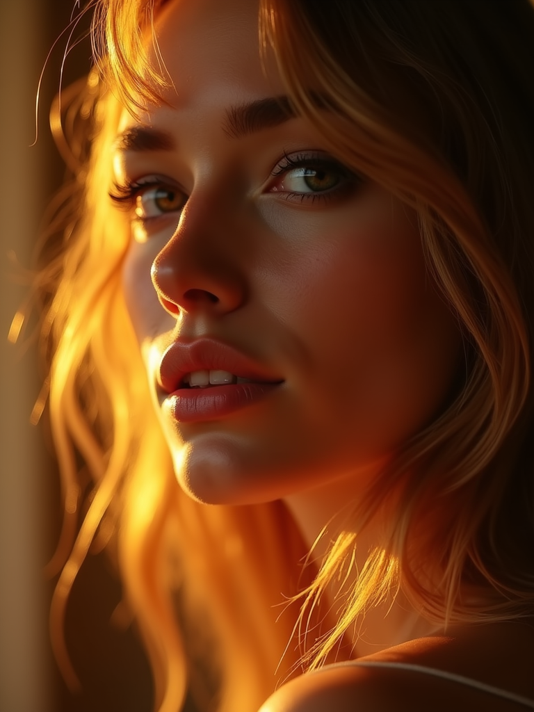 Extreme close-up portrait of model with golden hour lighting. Glowing skin, sensual features highlighted . Dramatic side lighting, cinematic quality.