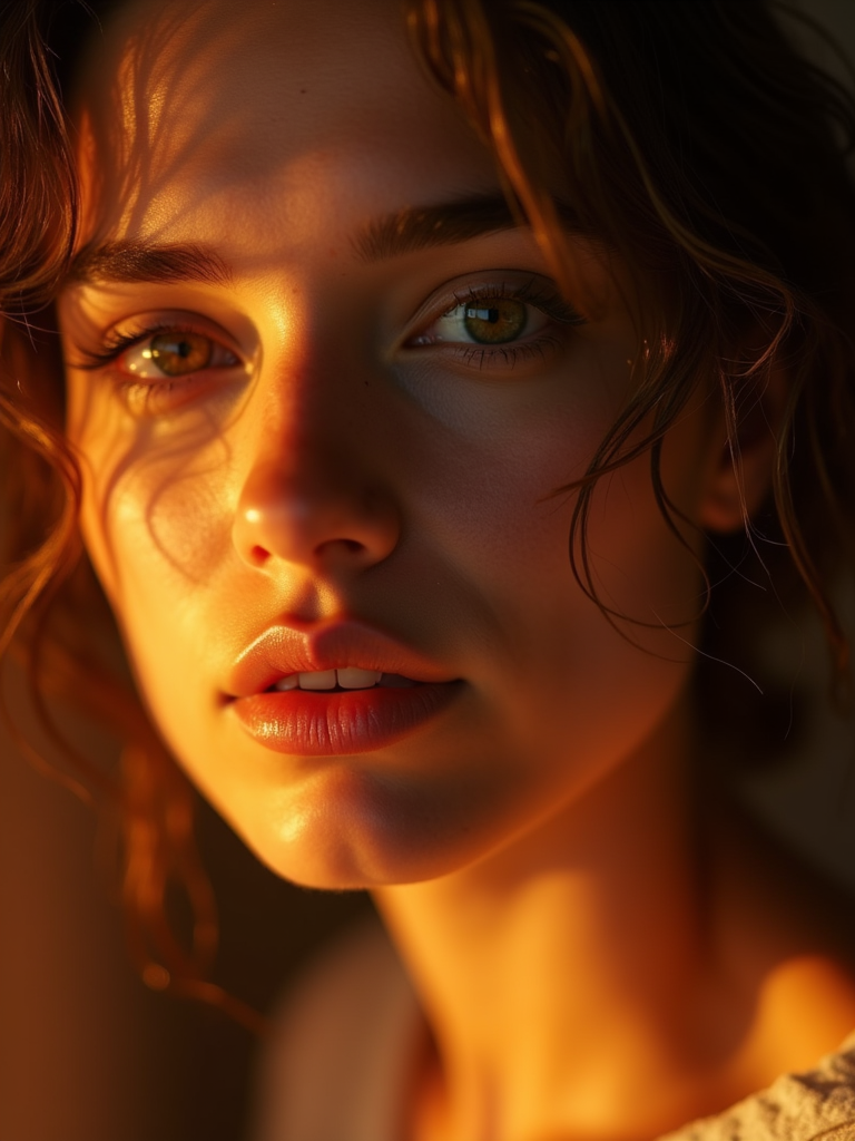 Extreme close-up portrait of model with golden hour lighting. Glowing skin, sensual features highlighted . Dramatic side lighting, cinematic quality.