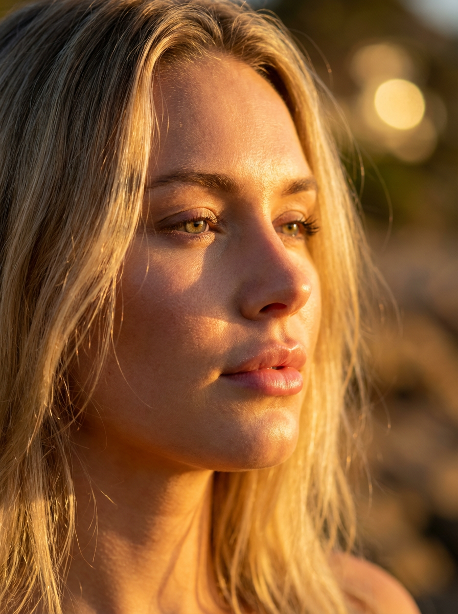 Extreme close-up portrait of model with golden hour lighting. Glowing skin, sensual features highlighted . Dramatic side lighting, cinematic quality.