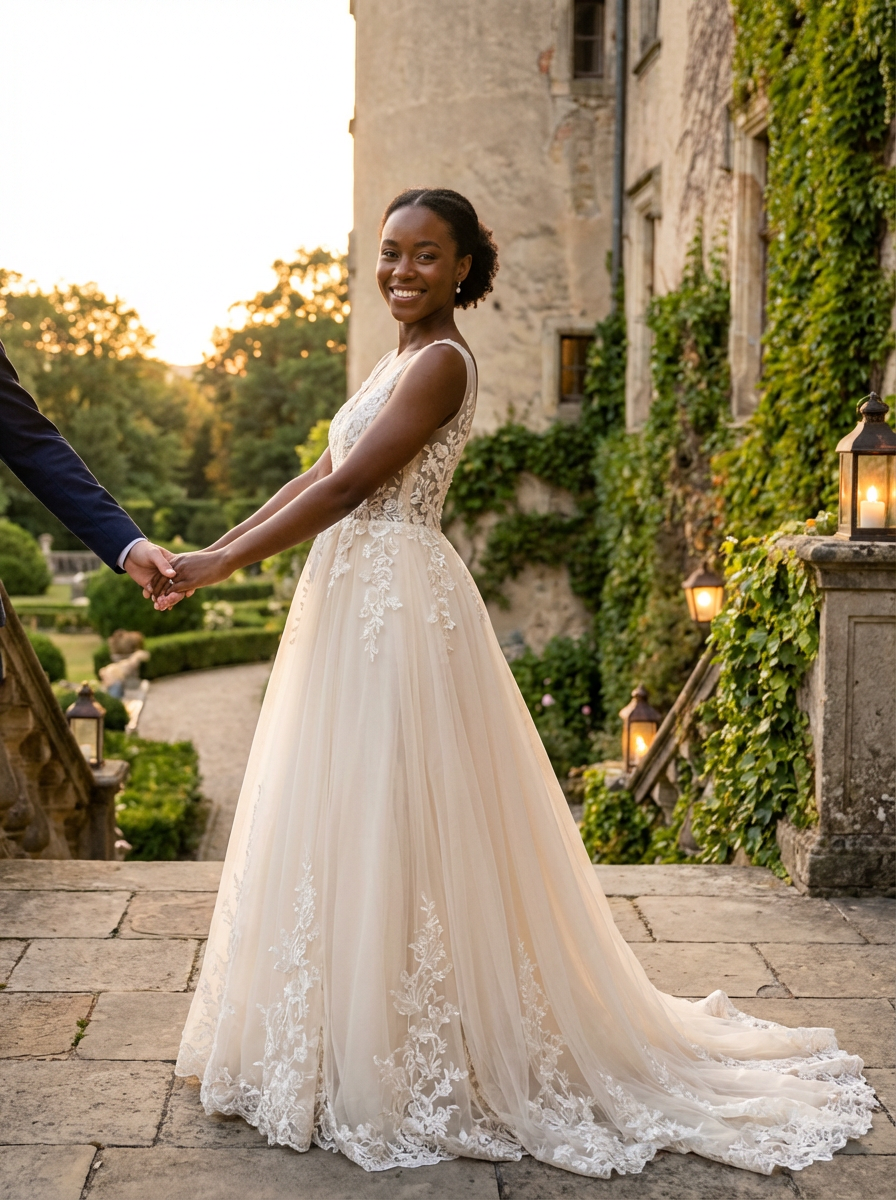 Fairytale-inspired engagement shoot in a castle setting. Model wearing an elegant princess-like gown . Romantic and regal ambiance.
