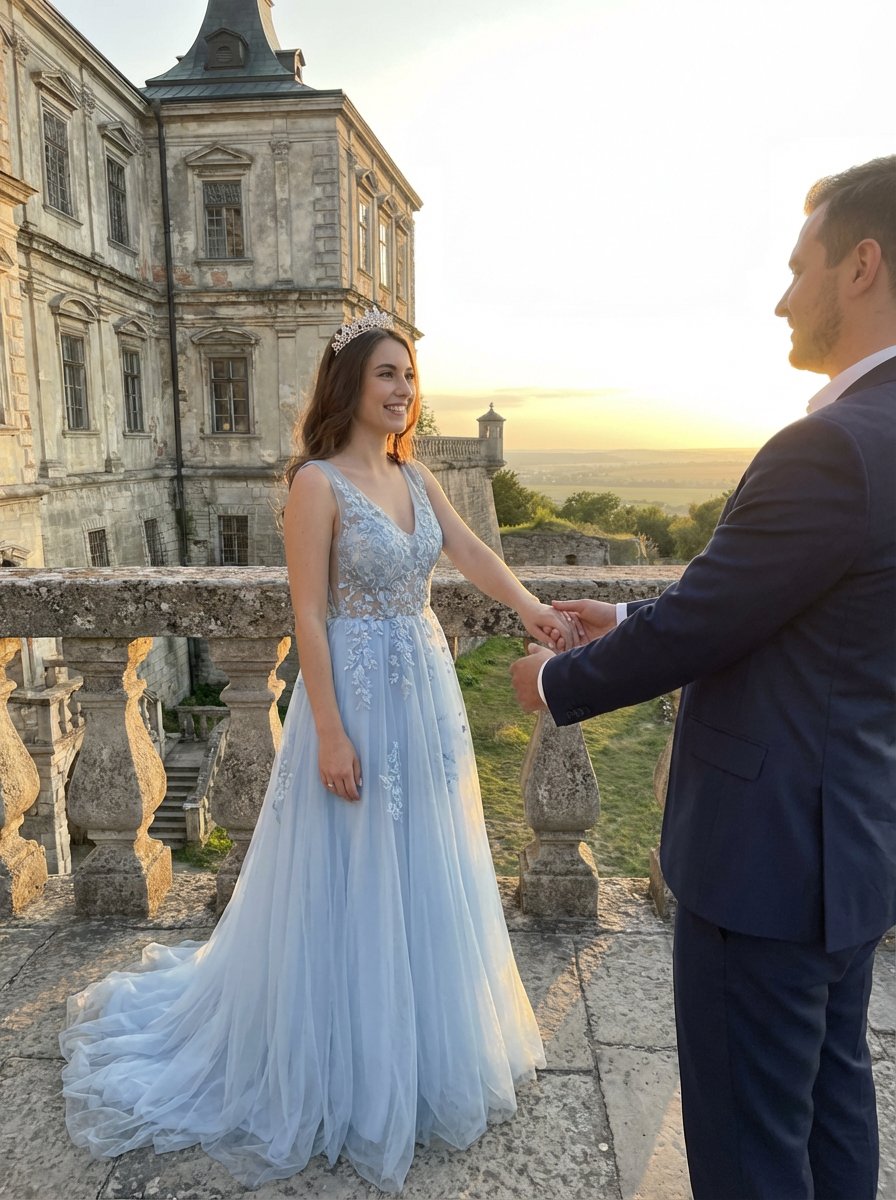 Fairytale-inspired engagement shoot in a castle setting. Model wearing an elegant princess-like gown . Romantic and regal ambiance.