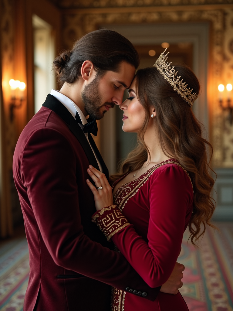 Fairytale-inspired engagement shoot in a castle setting. Wearing a royal-inspired velvet suit . Romantic and regal ambiance.