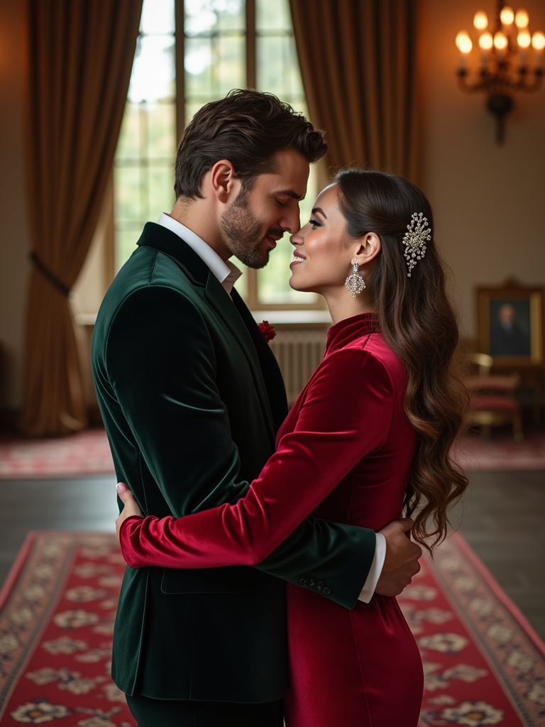 Fairytale-inspired engagement shoot in a castle setting. Wearing a royal-inspired velvet suit . Romantic and regal ambiance.