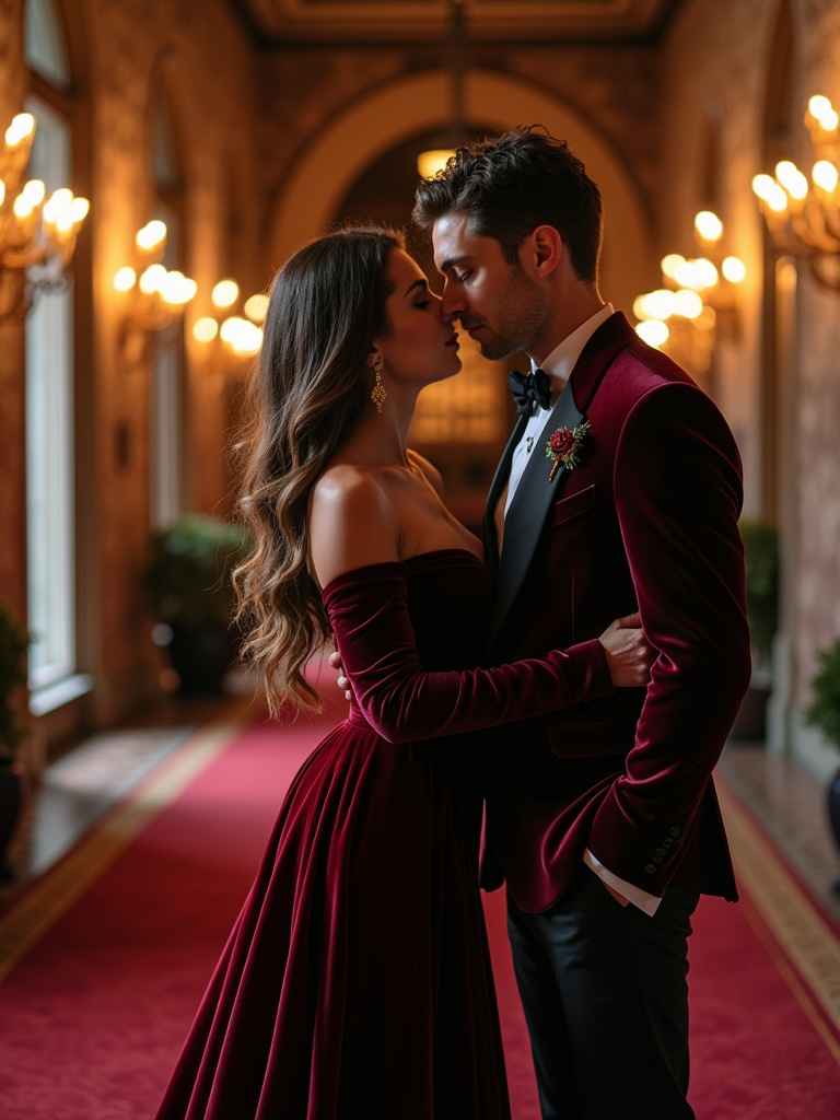 Fairytale-inspired engagement shoot in a castle setting. Wearing a royal-inspired velvet suit . Romantic and regal ambiance.