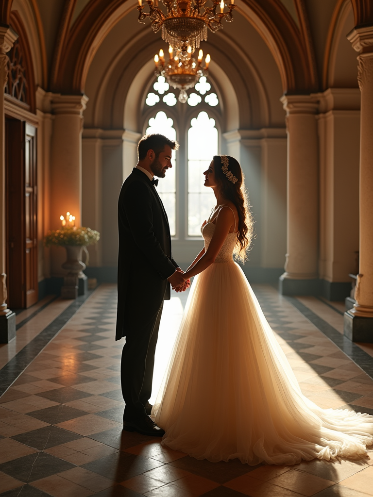 Fairytale-inspired engagement shoot in a castle setting. Wearing an elegant princess-like gown . Romantic and regal ambiance.