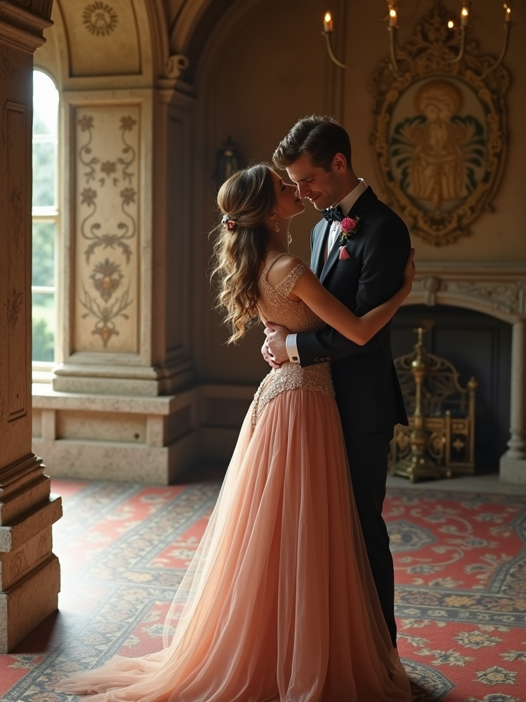 Fairytale-inspired engagement shoot in a castle setting. Wearing an elegant princess-like gown . Romantic and regal ambiance.