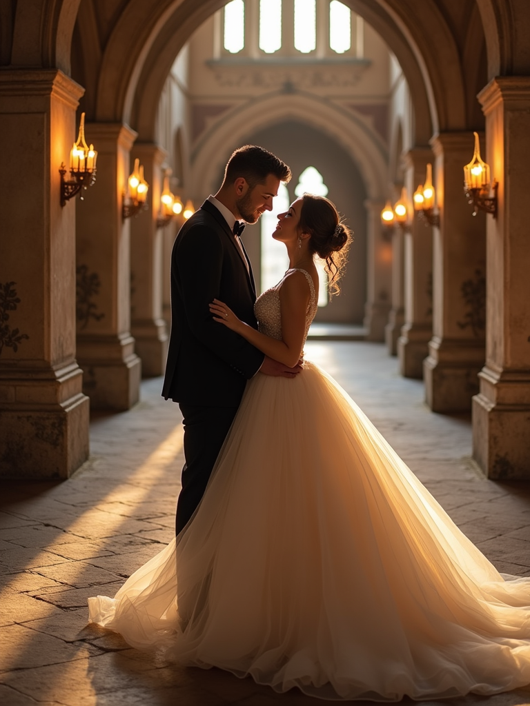 Fairytale-inspired engagement shoot in a castle setting. Wearing an elegant princess-like gown . Romantic and regal ambiance.