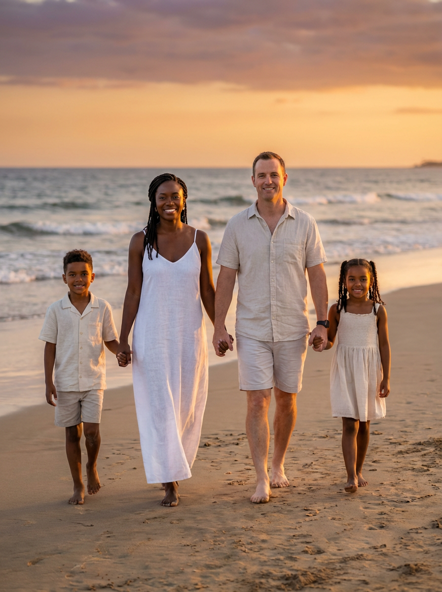 family beach portrait at sunset, everyone wearing light summer clothing, golden hour lighting, ocean waves in background, walking hand in hand along shoreline, relaxed and joyful mood