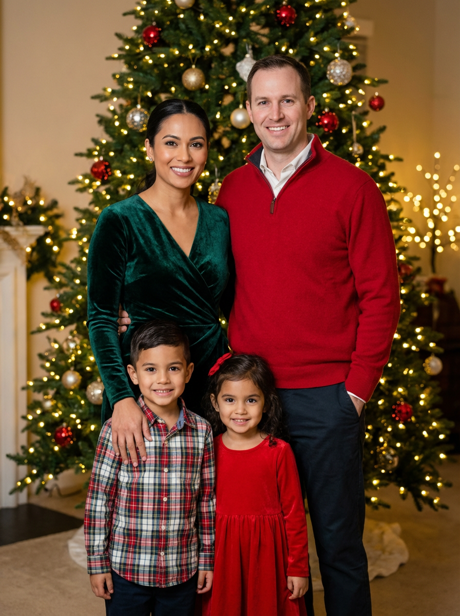 family holiday portrait in front of Christmas tree, everyone wearing festive colors, twinkling lights background, formal but comfortable clothing, traditional family pose with warm expressions