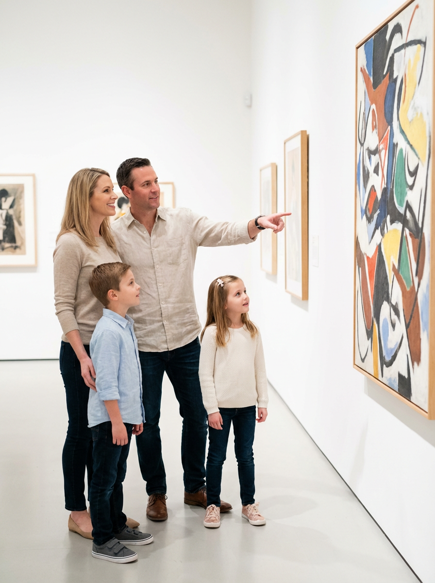family portrait at art museum or gallery, everyone wearing nice casual outfits, artwork visible in background, appreciating culture together, sophisticated and educational atmosphere