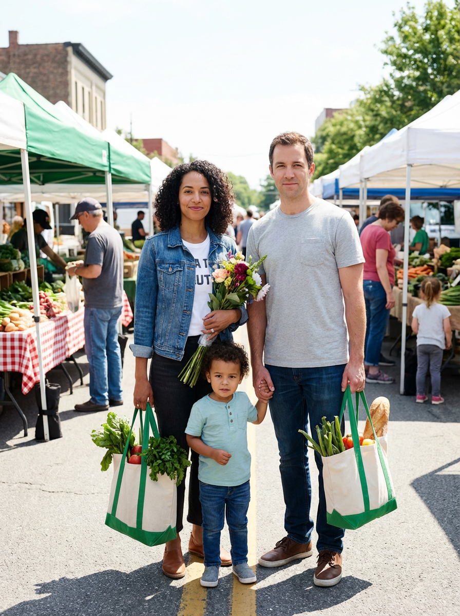 family portrait at farmers market, everyone wearing casual weekend outfits, outdoor market stalls background, carrying fresh produce or flowers, exploring and shopping together, community atmosphere