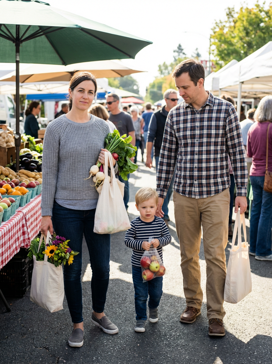 family portrait at farmers market, everyone wearing casual weekend outfits, outdoor market stalls background, carrying fresh produce or flowers, exploring and shopping together, community atmosphere