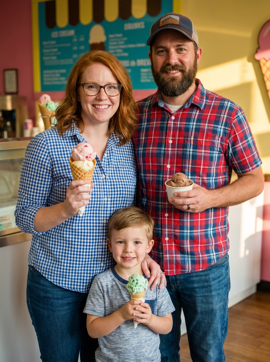 family portrait at ice cream shop, everyone wearing summer casual clothes, colorful shop interior, enjoying ice cream treats together, sweet and cheerful moment, indulgent family time