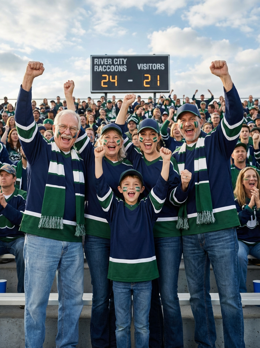 family portrait at sports event, everyone wearing team colors or jerseys, stadium or field background, cheering and celebrating together, enthusiastic and spirited atmosphere