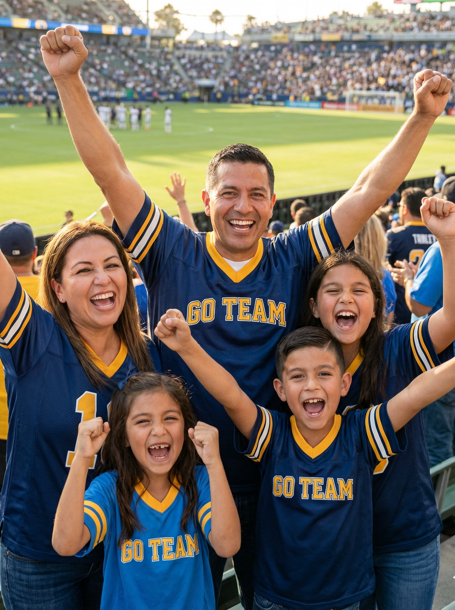 family portrait at sports event, everyone wearing team colors or jerseys, stadium or field background, cheering and celebrating together, enthusiastic and spirited atmosphere