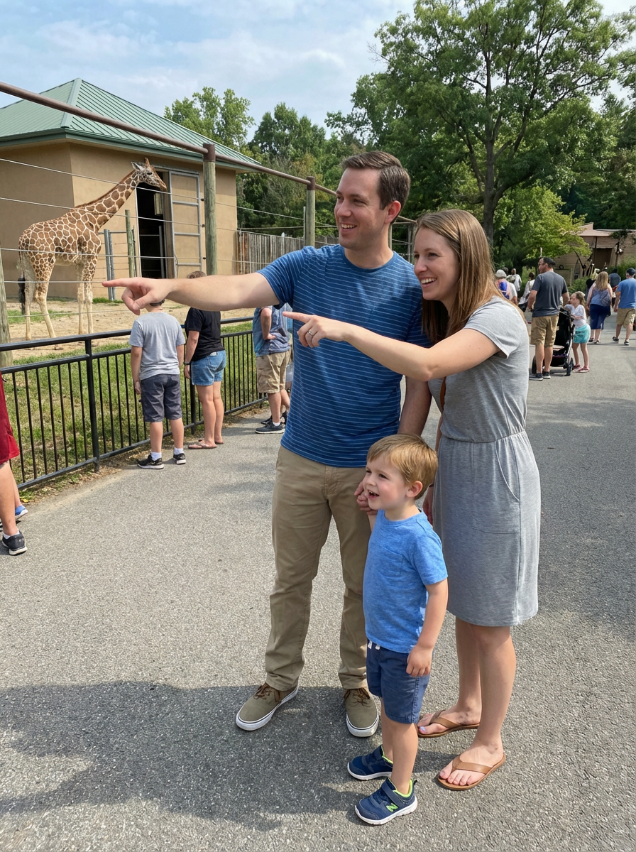 family portrait at zoo or aquarium, everyone wearing comfortable walking clothes, animal exhibits in background, pointing and looking at displays together, educational family outing