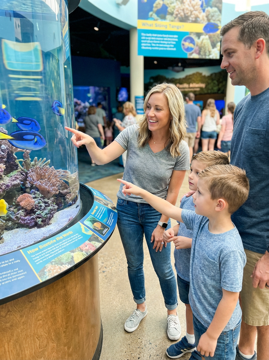 family portrait at zoo or aquarium, everyone wearing comfortable walking clothes, animal exhibits in background, pointing and looking at displays together, educational family outing