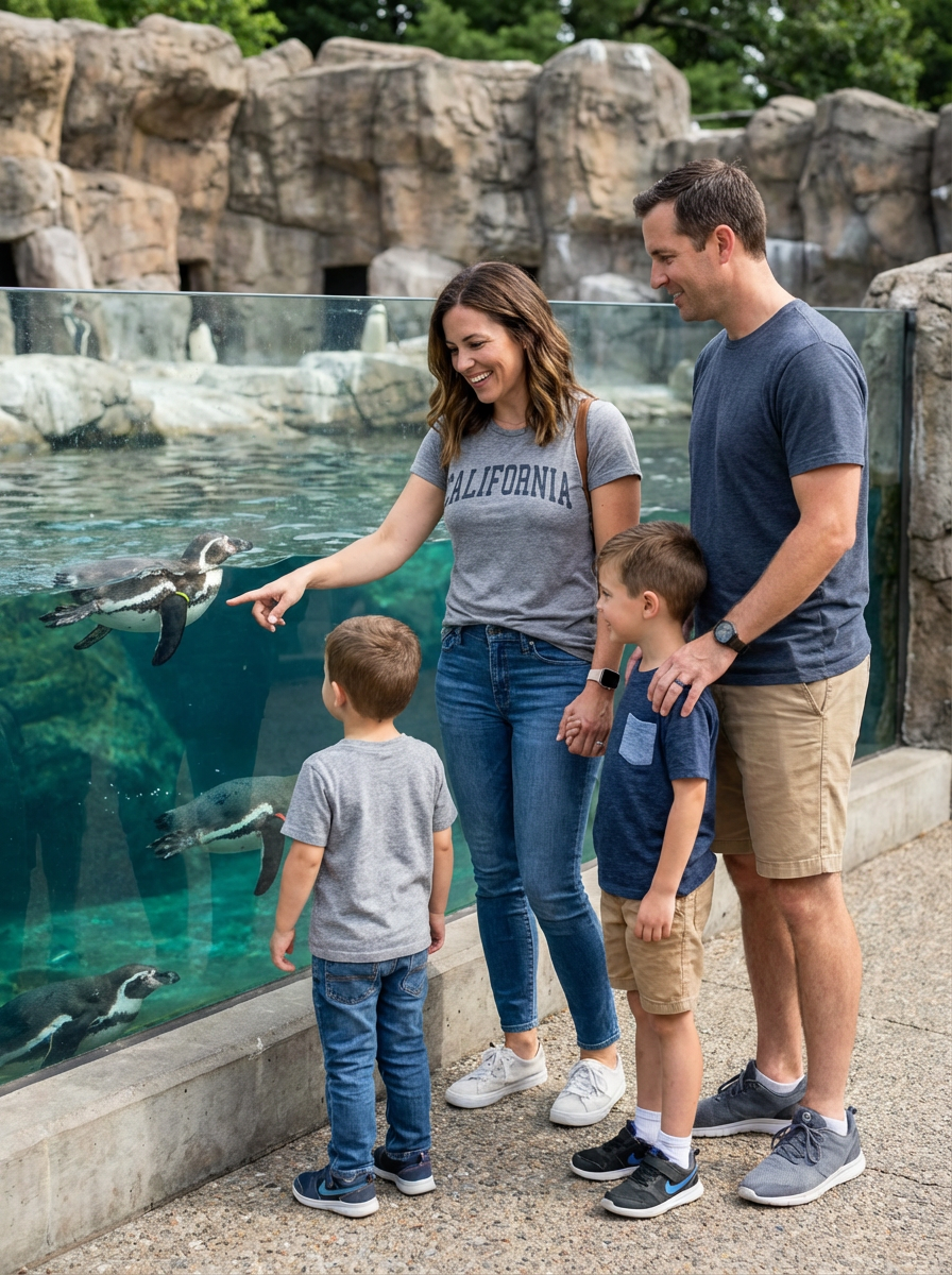 family portrait at zoo or aquarium, everyone wearing comfortable walking clothes, animal exhibits in background, pointing and looking at displays together, educational family outing