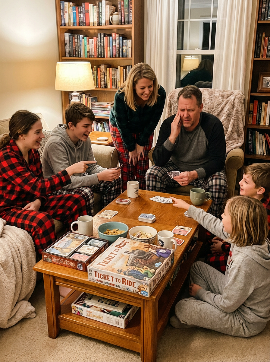 family portrait during game night at home, everyone wearing cozy pajamas or casual clothes, board games or cards on table, living room setting, competitive but loving family fun