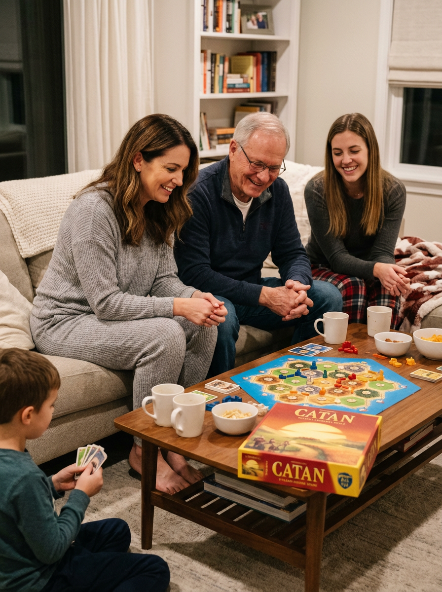 family portrait during game night at home, everyone wearing cozy pajamas or casual clothes, board games or cards on table, living room setting, competitive but loving family fun