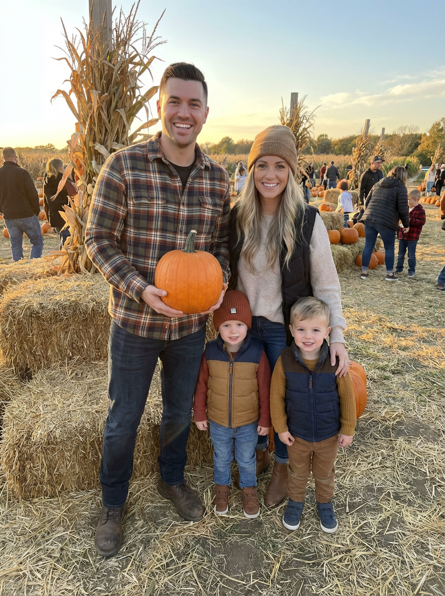 family portrait during seasonal activity, everyone wearing weather-appropriate clothing, seasonal decorations or activities visible, celebrating traditions together, festive and memorable occasion