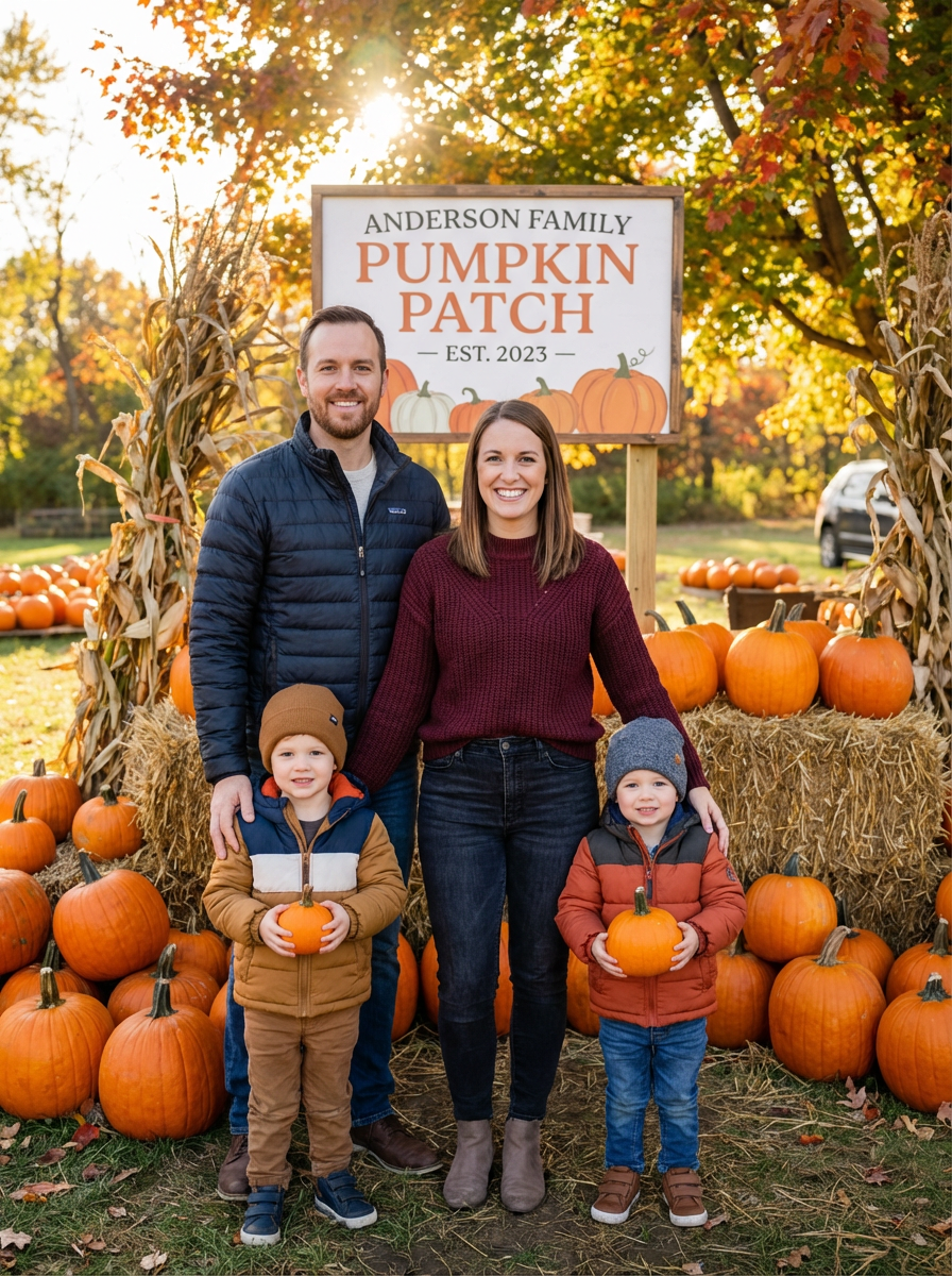 family portrait during seasonal activity, everyone wearing weather-appropriate clothing, seasonal decorations or activities visible, celebrating traditions together, festive and memorable occasion