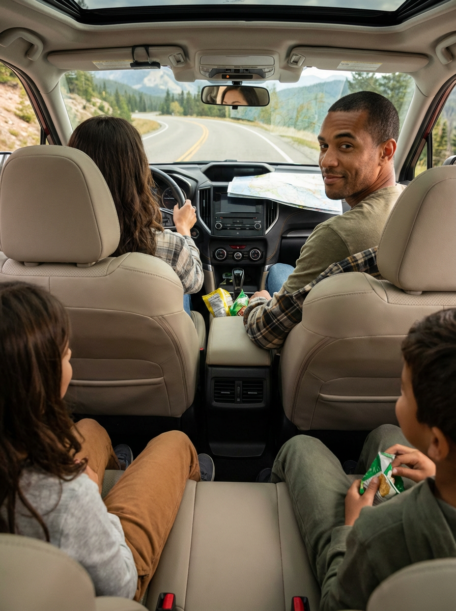 family portrait in car during road trip, everyone wearing travel comfortable clothes, scenic landscape visible through windows, maps or snacks visible, adventure and journey theme
