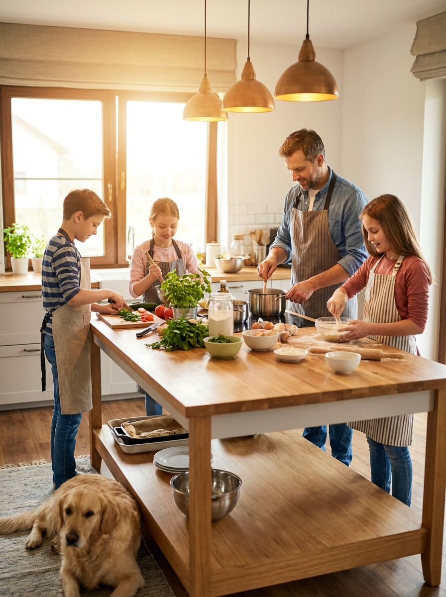 family portrait in kitchen while cooking together, everyone wearing aprons over casual clothes, warm indoor lighting, cooking ingredients visible, working together on meal preparation, domestic bliss