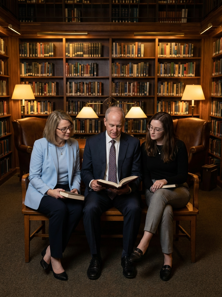 family portrait in library or bookstore, everyone wearing smart casual clothing, bookshelves in background, reading or looking at books together, quiet and intellectual atmosphere